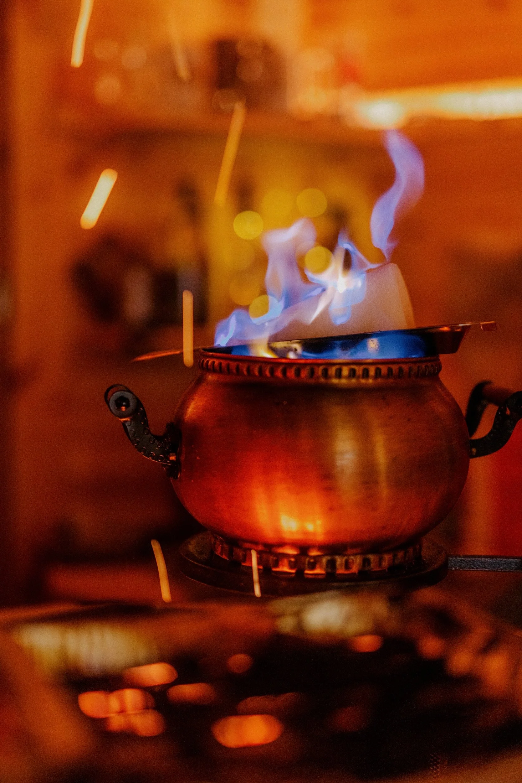 Vor der Hütte erwartet euch eine heiße Feuerzangenbowle am wärmenden Lagerfeuer.